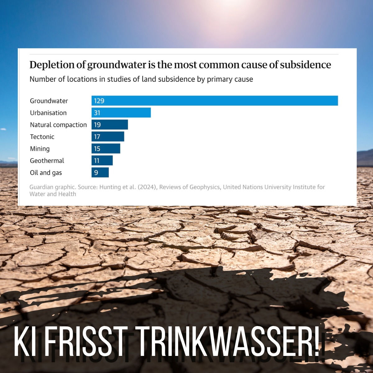 Schon das Training großer KI Modelle verbraucht enorme Mengen Wasser. Und auch jede Nutzung braucht Kühlung für Server, Energie für Strom und Ressourcen für die Herstellung der Technik. Ein Teil des Wassers verdunstet oder wird verschmutzt und steht danach nicht mehr zur Verfügung oder regeneriert sich viel zu langsam.